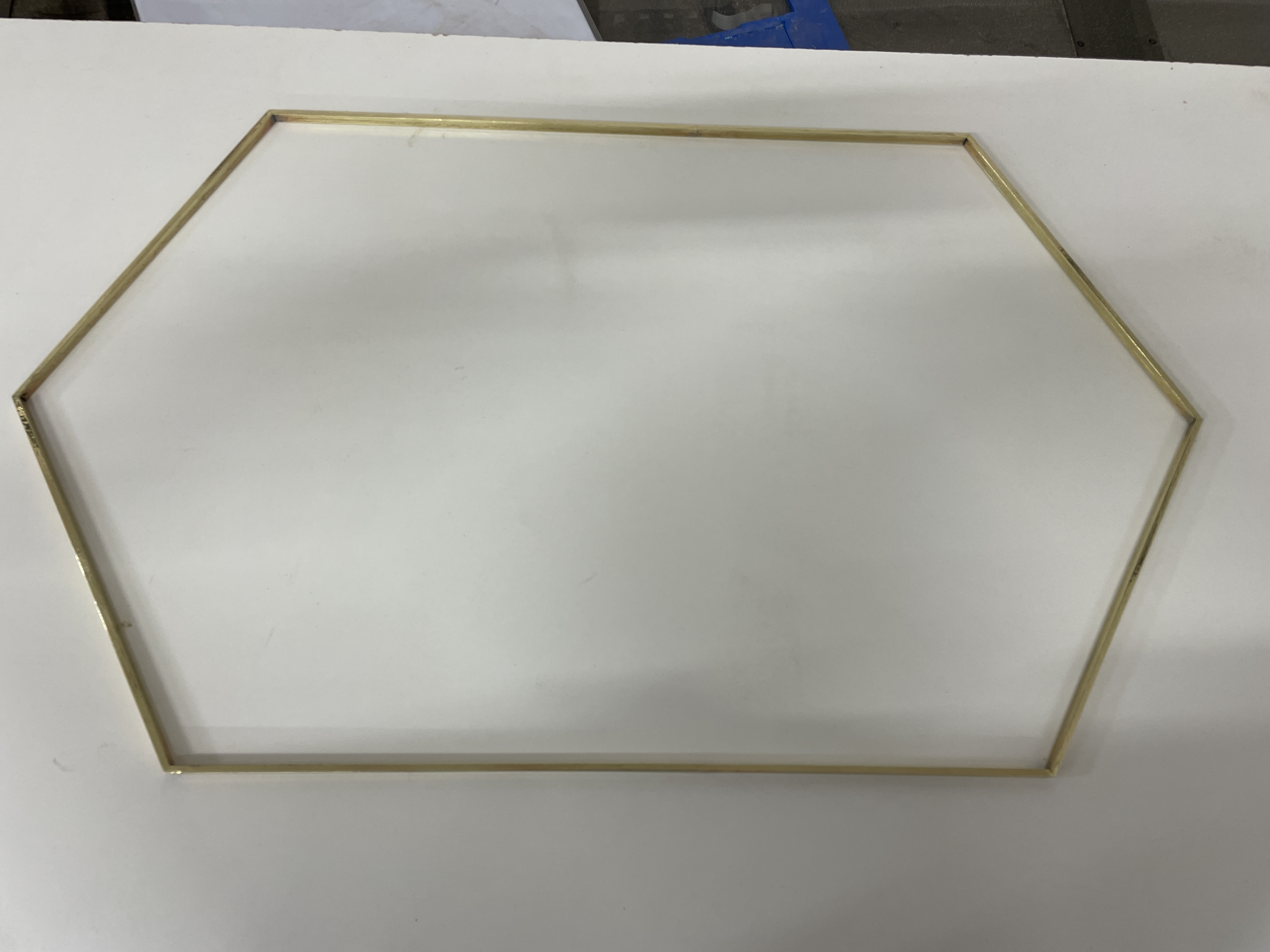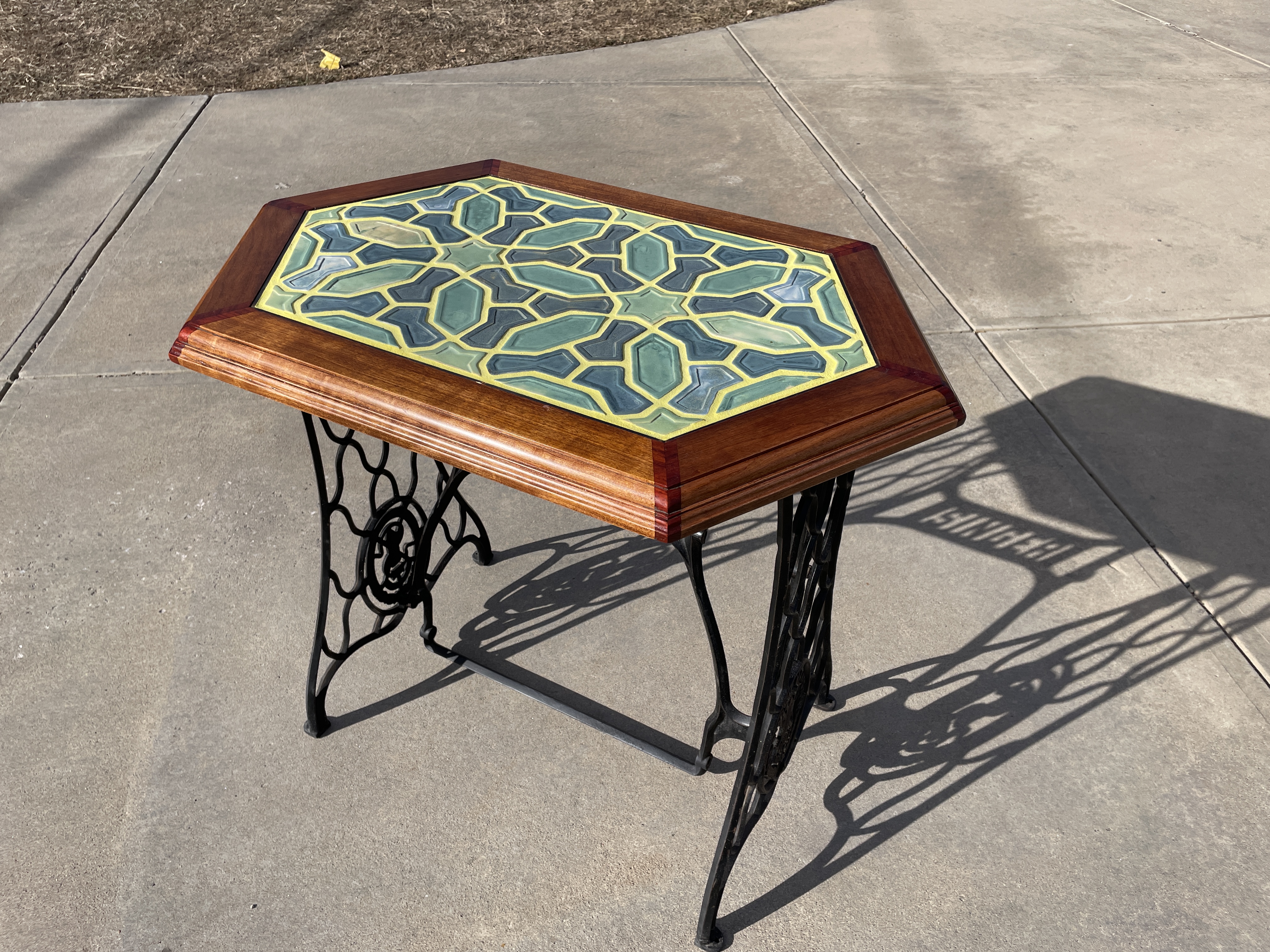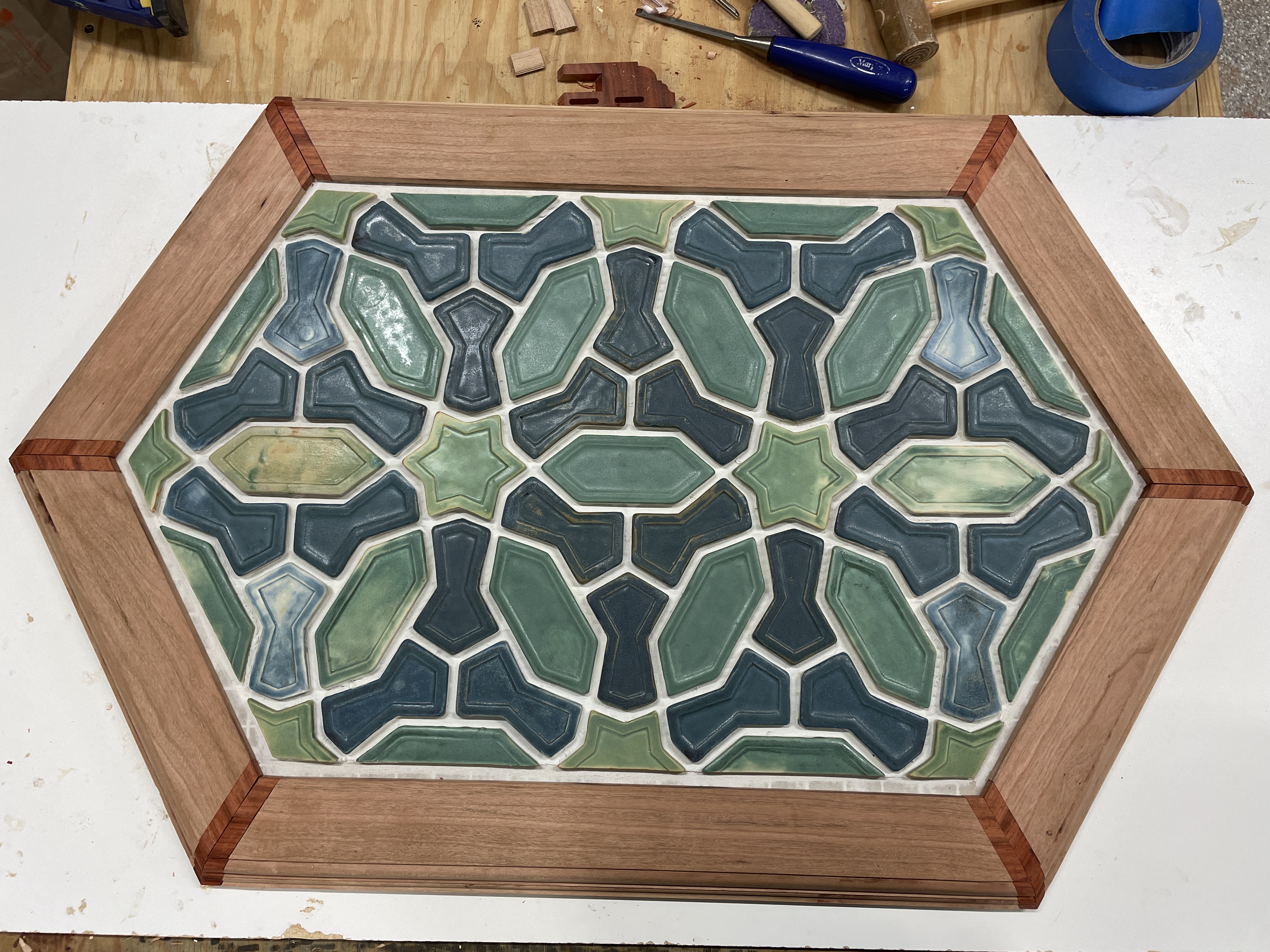 Brass tubing loops around the perimeter of the tiles to provide an outer edge for the grout before it encounters the wood. Using a chemical blackening agent I darkened the brass into subtle shades of blue and green to blend harmoniously. Yellow iron-oxide pigment was added to the grout to grant it its emphasis.